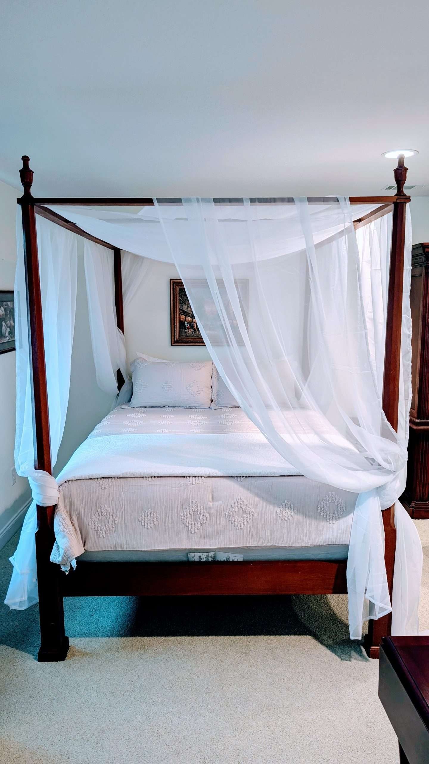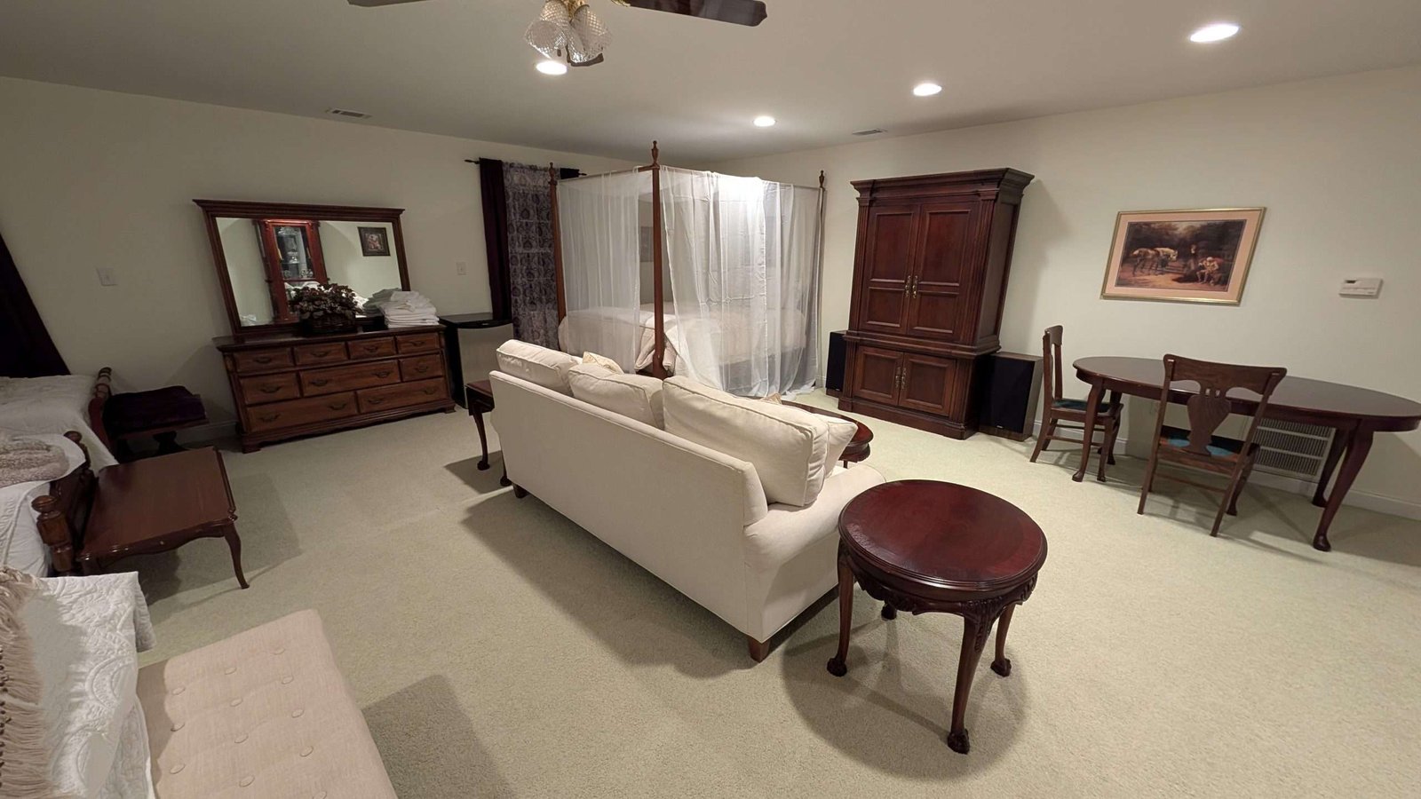 This spacious and serene suite is designed to accommodate up to 6-7 guests with two queen beds, a twin bed, and a couch. The suite also includes a huge master bathroom with walk-in closet. It is the only room at Midway Manor that is fully handicap accessible on the main level of the home.